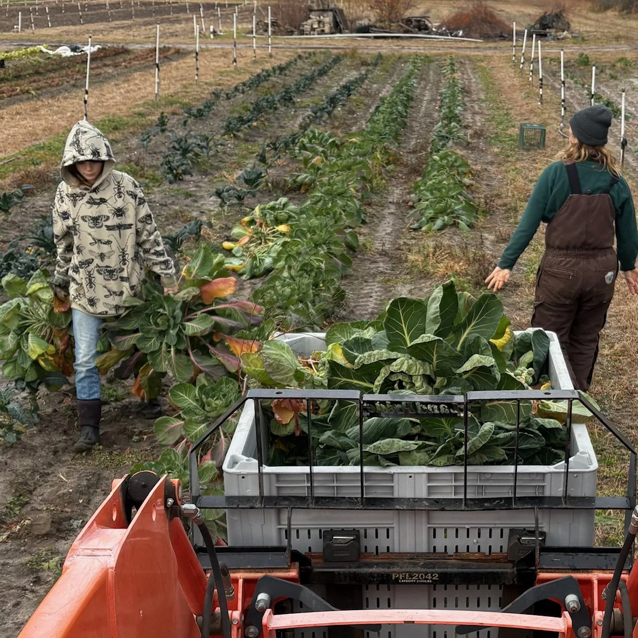 Arugula, Spinach, Lettuce Mix, Broccoli (heads and tender side shoots), Brussels (on the stalk), Cauliflower (white and orange types), Carrots (purple and orange), Cabbage, Kale, Rainbow Chard, Watermelon Radish, Parsley.